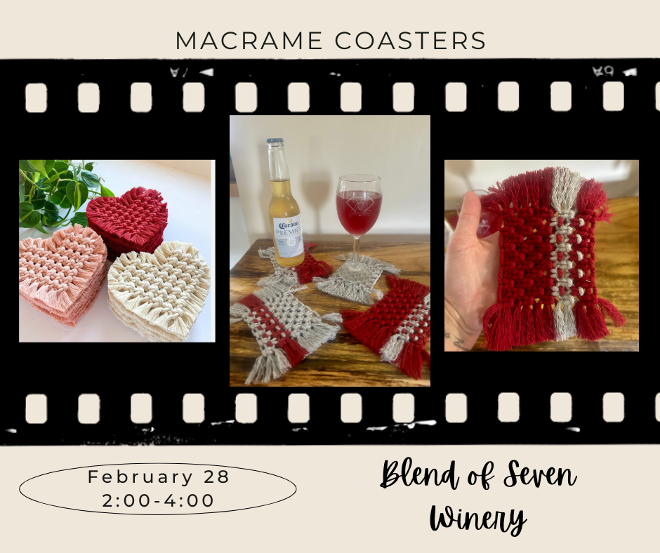 Kristin Finnerty makes macrame fun and more importantly, EASY! Come join us and make your choice of 2 total coasters. -Cost is $35/person for a total of 2 macrame coasters -If you have multiple people who would like to sit together, PLEASE have one person buy all the tickets. If that is not convenient, please be sure to call us at 740-692-9003 OR note all names at checkout. -Wine and snacks available for purchase -Sign up by Monday, February 23rd Ticket link: https://blendofsevenwinery.com/shop/ols/categories/event-tickets
