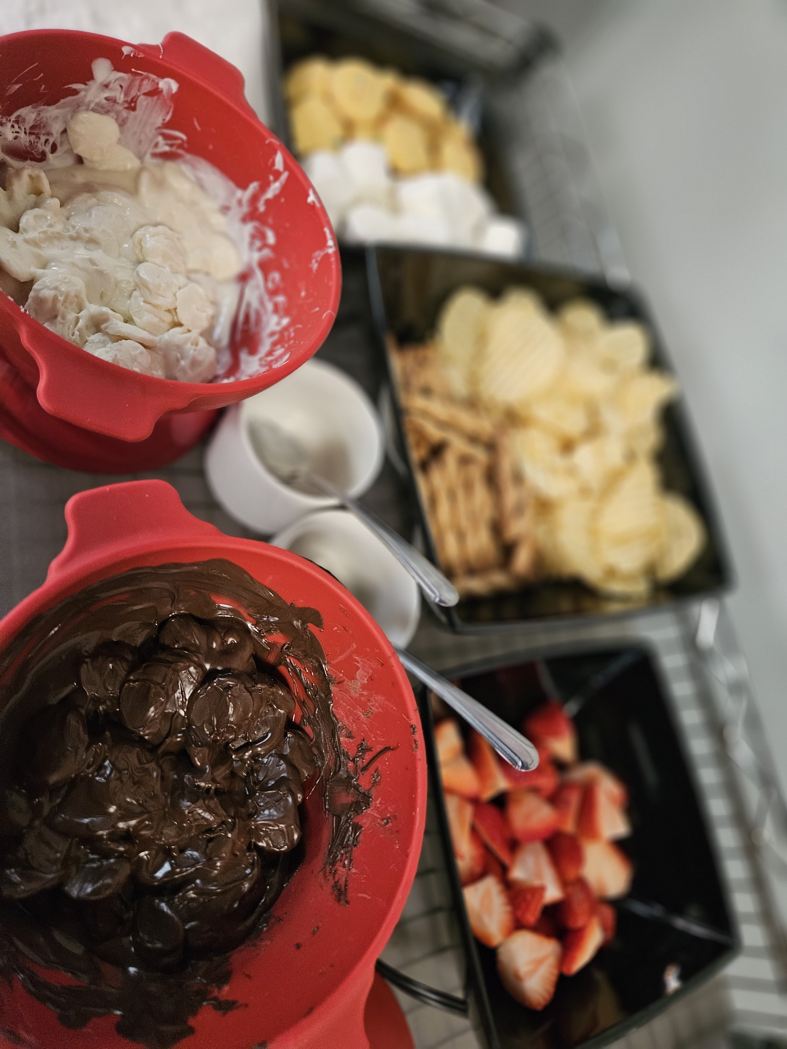 Chocolate fondue with dipping items featuring both white and dark chocolate.