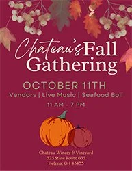 Join us for the 1st Annual Fall Gathering on Saturday, October 11, 2025, from 11:00 a.m. – 7:00 p.m.! Celebrate the season with a day full of community and fun featuring a variety of unique vendors, a mouthwatering seafood boil, and live music that will keep the energy going all day long. Whether you’re shopping, savoring delicious flavors, or enjoying great tunes, this fall festival is the perfect way to spend a crisp autumn Saturday at Chateau Winery & Vineyard.